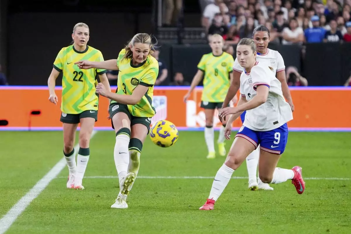 Australia defender Ellie Carpenter, foreground, dribbles during the first half of a group stage match against the United States in the SheBelieves Cup women's soccer tournament, Sunday, Feb. 23, 2025, in Glendale, Ariz. (AP Photo/Samantha Chow)