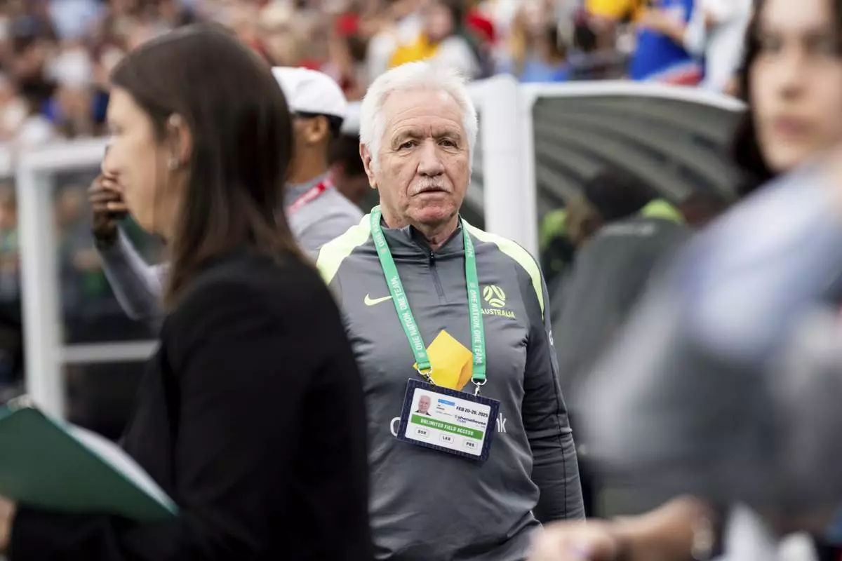 Australia head coach Tom Sermanni looks on before a group stage match against the United States in the SheBelieves Cup women's soccer tournament, Sunday, Feb. 23, 2025, in Glendale, Ariz. (AP Photo/Samantha Chow)
