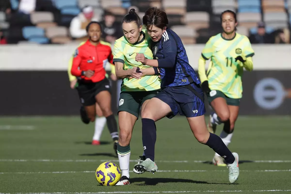 Australia forward Caitlin Foord, left, and Japan defender Toko Koga, right, battle for the ball during the SheBelieves Cup women's soccer tournament, Thursday, Feb. 20, 2025, in Houston. (AP Photo/Michael Wyke)