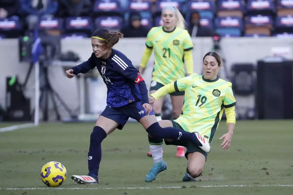 Japan midfielder Yui Hasegawa, left, gets control of the ball as Australia midfielder Katrina Gorry (19) falls during the SheBelieves Cup women's soccer tournament, Thursday, Feb. 20, 2025, in Houston. (AP Photo/Michael Wyke)