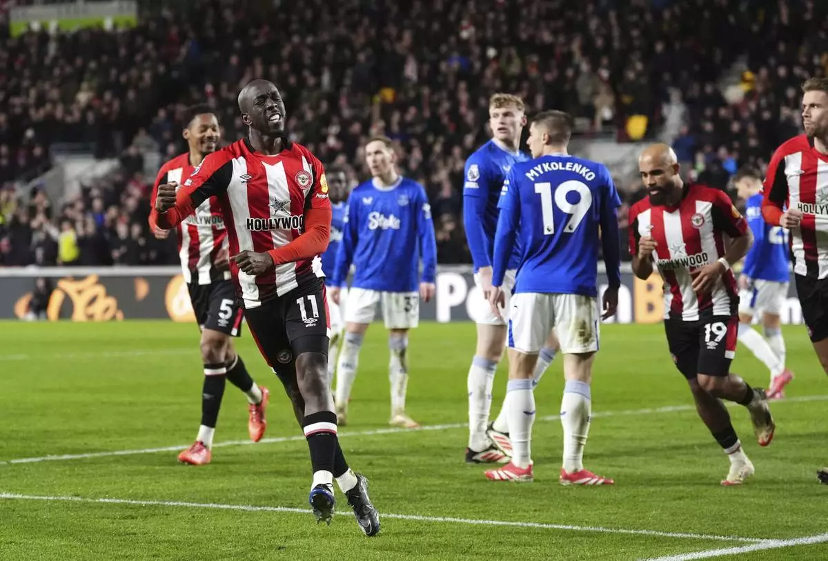 Brentford's Yoane Wissa celebrates scoring his side's first goal of the gamel, during the English Premier League soccer match between Brentford and Everton at Gtech Community Stadium, in London, Wednesday, Feb. 26, 2025. (Adam Davy/PA via AP)