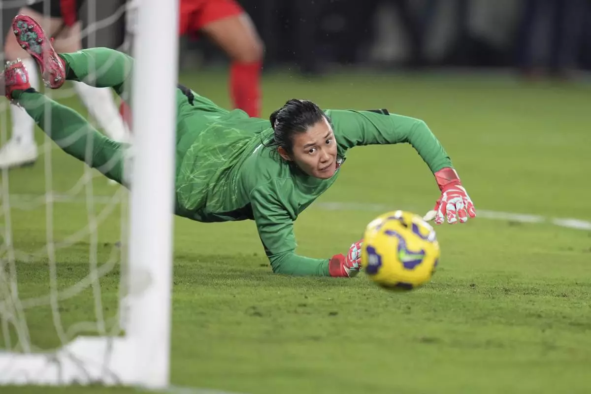 Japan goalkeeper Ayaka Yamashita watches as a shot from United States forward Catarina Macario just misses during the first half of a SheBelieves Cup women's soccer tournament match Wednesday, Feb. 26, 2025, in San Diego. (AP Photo/Gregory Bull)