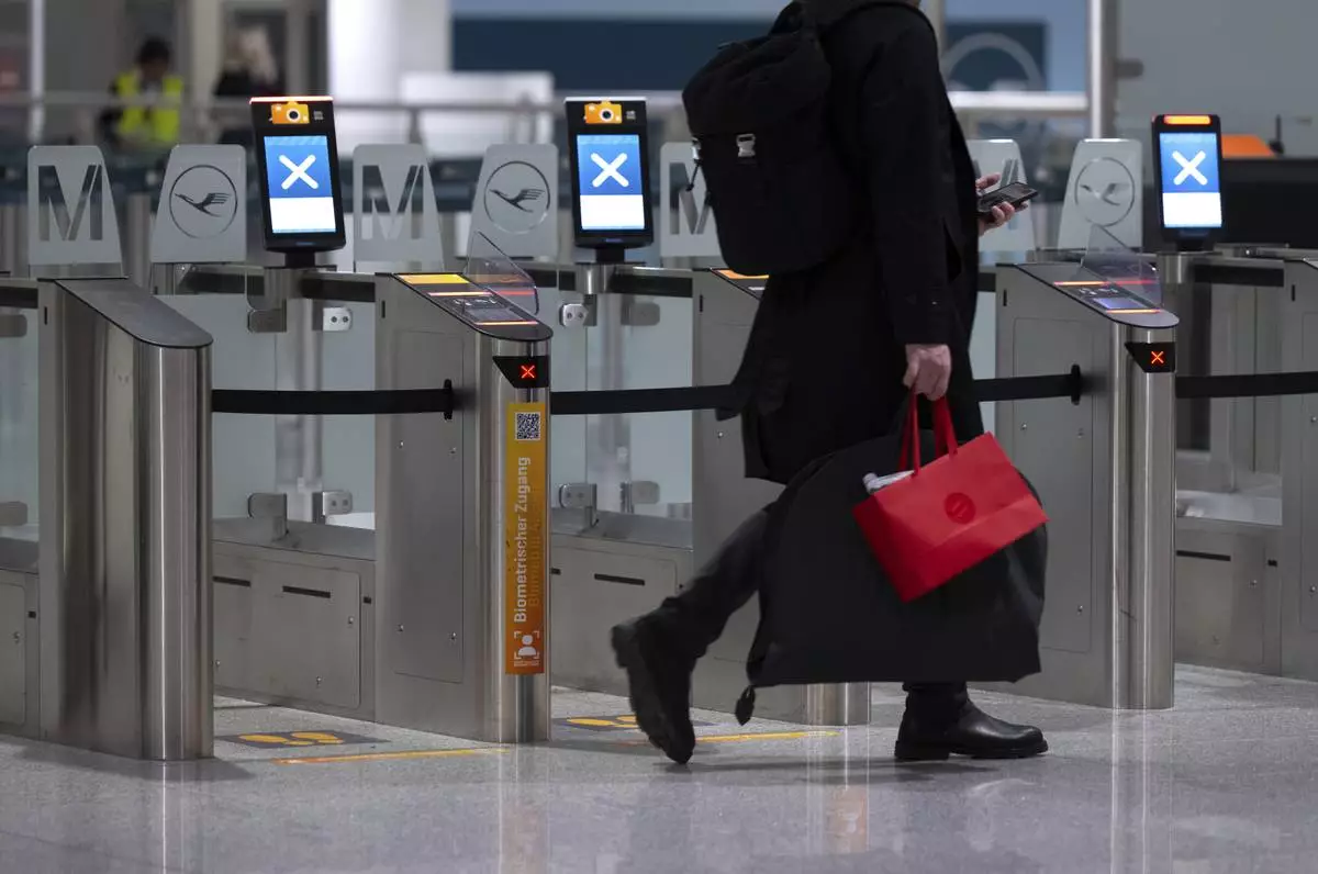 A passenger walks past closed security gates security at the Munich Airport in Munich, Germany, Thursday, Feb 27, 2025. (Sven Hoppe/dpa via AP)