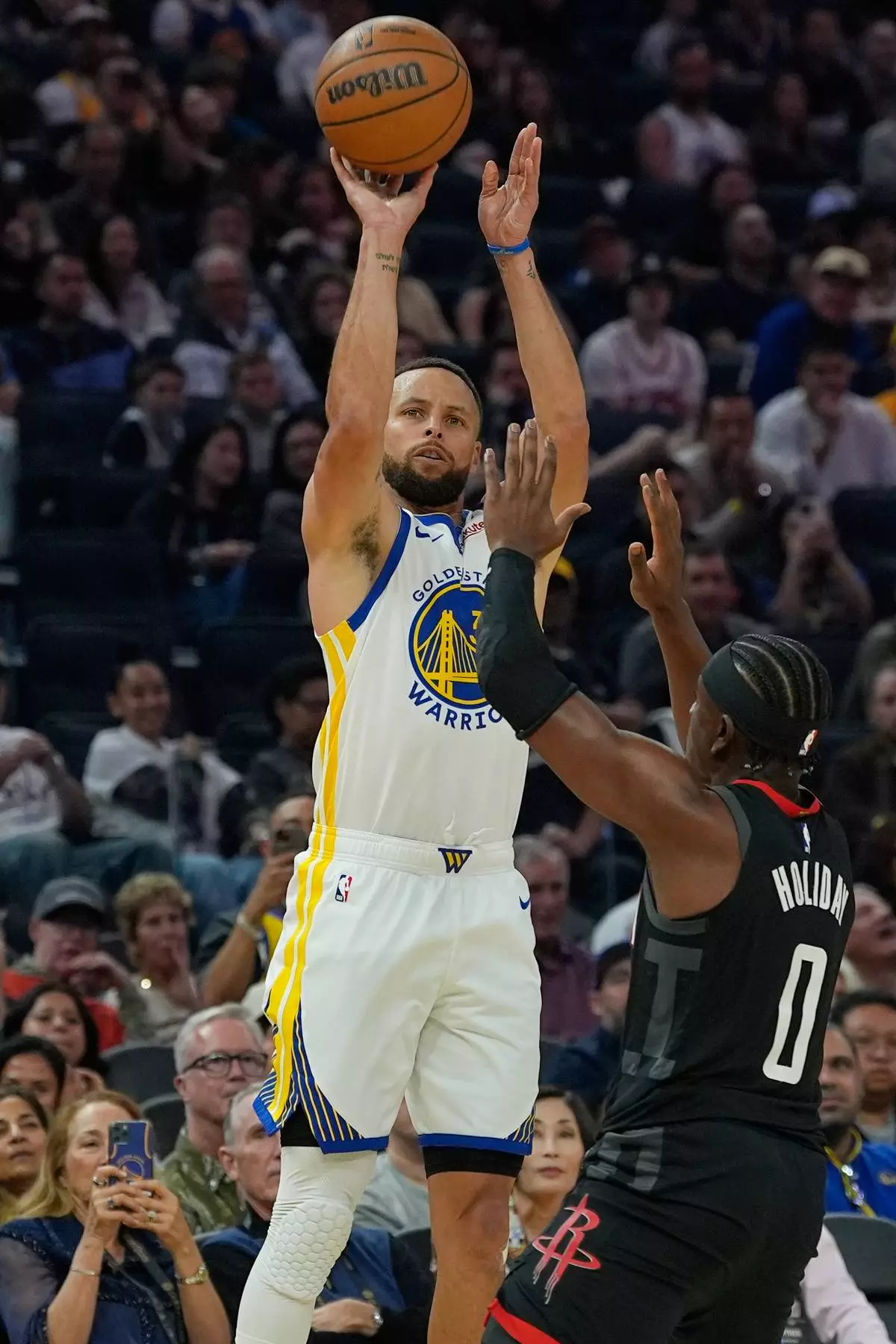 Golden State Warriors guard Stephen Curry, left, shoots a 3-point basket over Houston Rockets guard Aaron Holiday during the first half of an NBA basketball game, Sunday, April 5, 2026, in San Francisco. (AP Photo/Godofredo A. Vásquez)