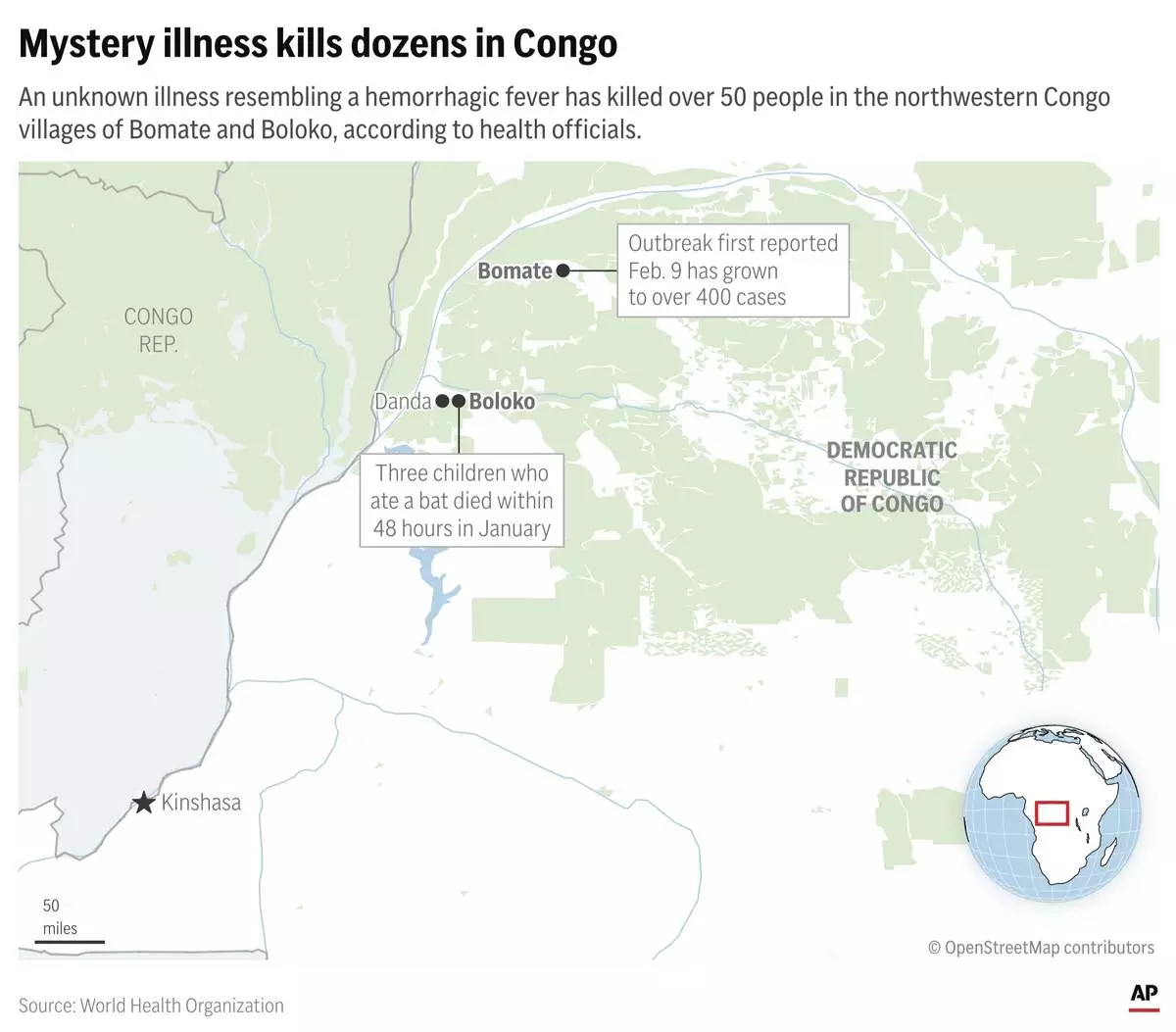 A hemorrhagic fever outbreak in the Democratic Republic of Congo has left more than 50 people dead. (AP Graphic)