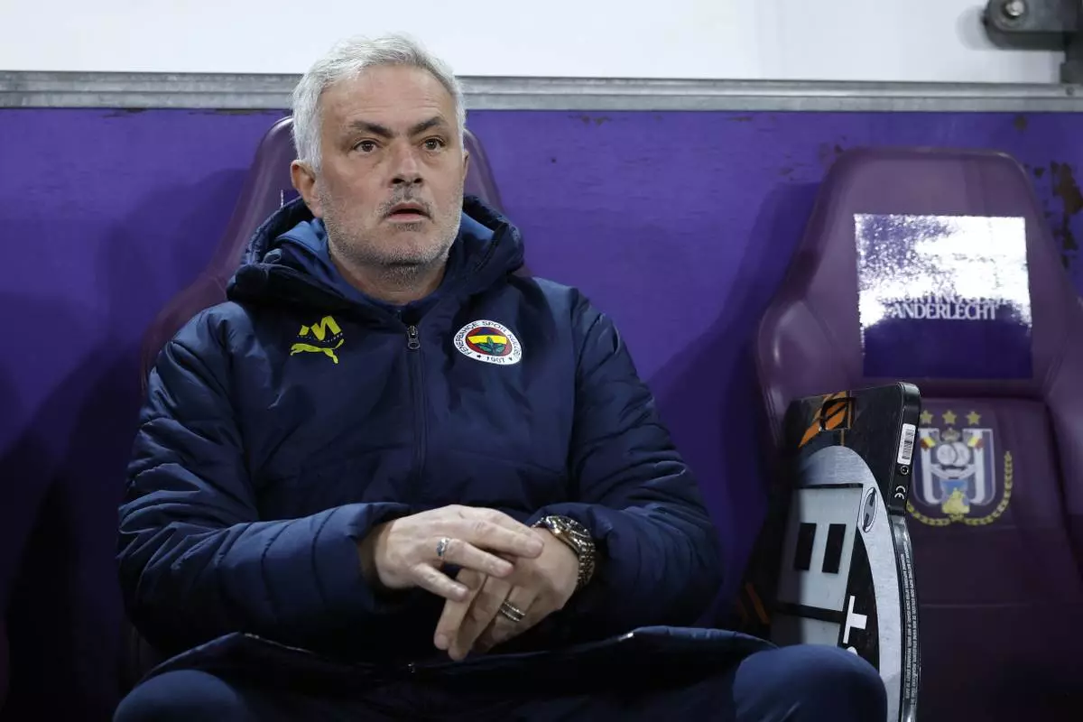 Fenerbahce's head coach Jose Mourinho, left, during the Europa League playoff second leg soccer match between Anderlecht and Fenerbahce at the RSC Anderlecht stadium in Brussels, Thursday, Feb. 20, 2025. (AP Photo/Omar Havana)