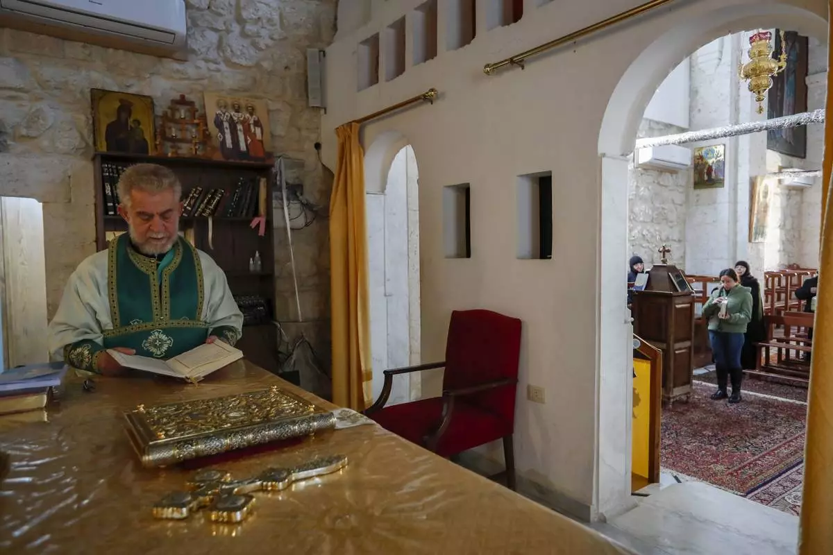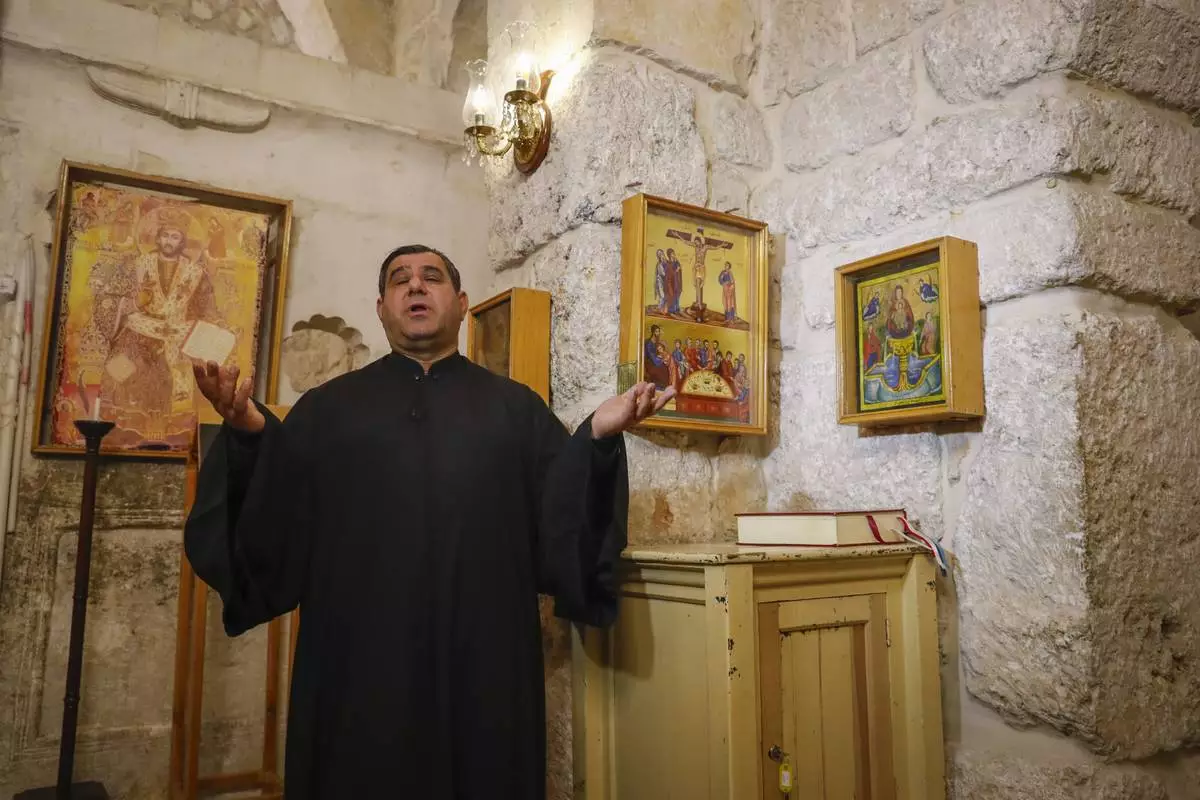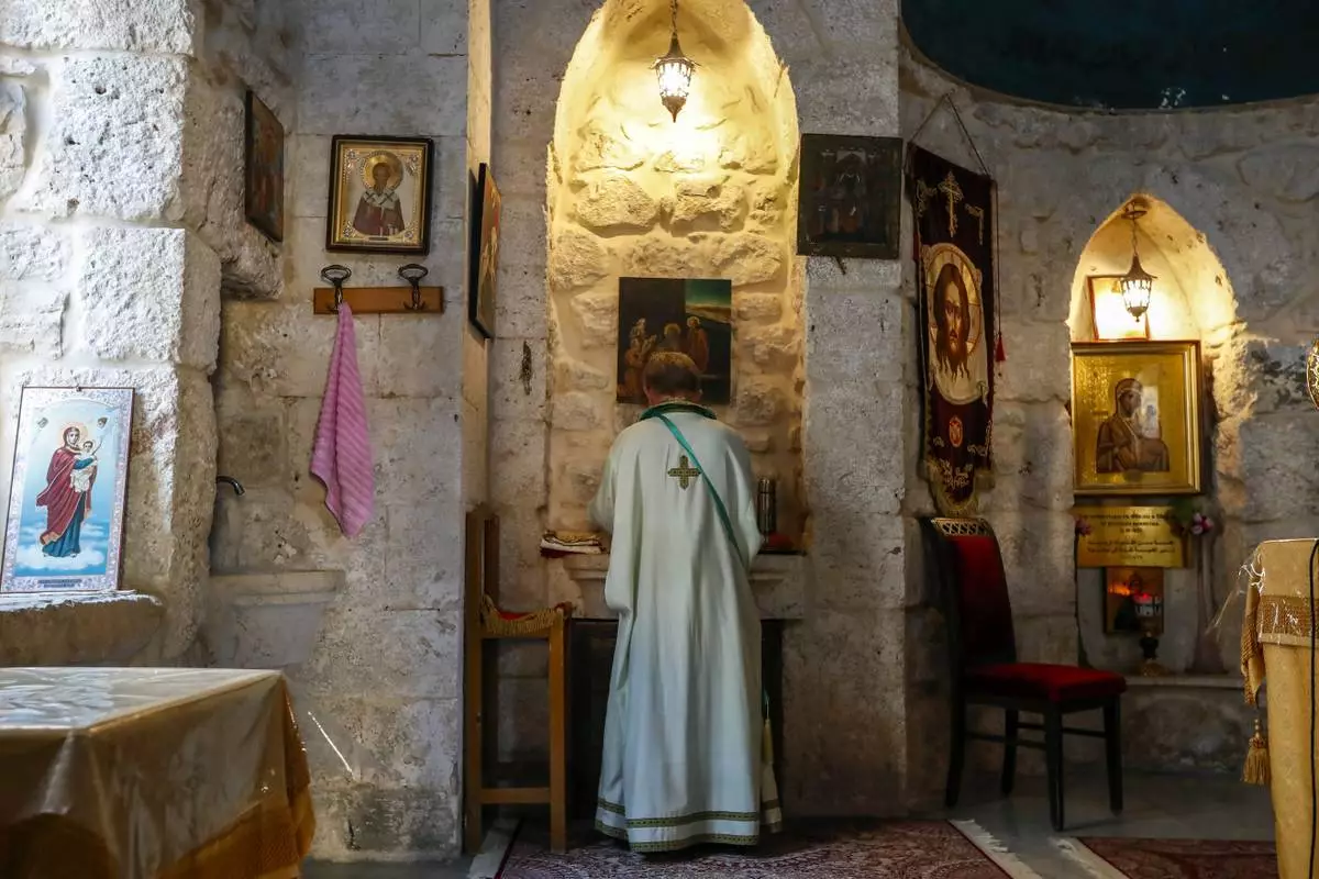 A priest holds Sunday Mass at the Greek Orthodox Convent of Saint Thecla in the town of Maaloula, Syria, Sunday Jan. 12, 2025. (AP Photo/Omar Sanadiki)