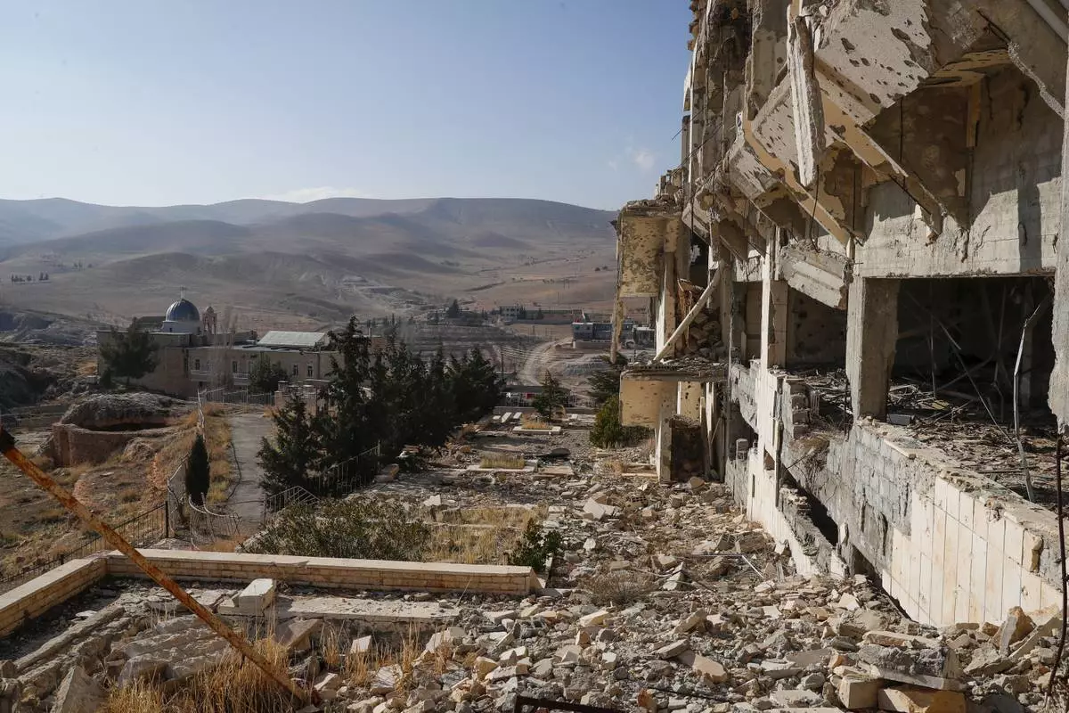 The remains of the Safir Hotel, destroyed in clashes between al-Qaida-linked fighters and Syrian government forces over a decade ago, overlook the Church of Saints Sergius and Bacchus in the town of Maaloula, Syria, Sunday, Jan. 12, 2025. (AP Photo/Omar Sanadiki)