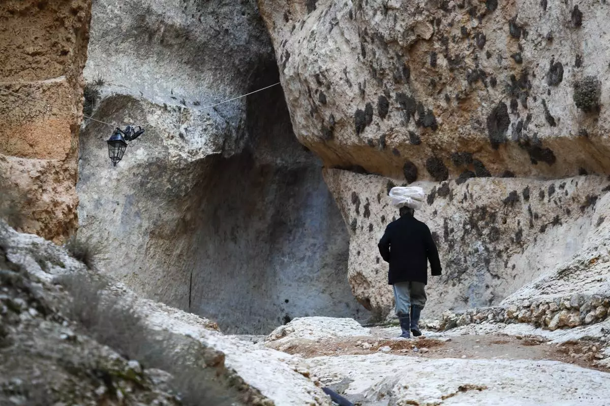 A man carrying loaves of bread on his head walks through a historic canyon in the town of Maaloula, Syria, Sunday Jan. 12, 2025.AP Photo/Omar Sanadiki)
