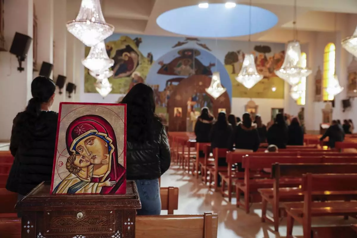 Syrian Christians gather for Sunday Mass at the Church of Saint George in the town of Maaloula, Syria, Sunday, Jan. 12, 2025. (AP Photo/Omar Sanadiki)