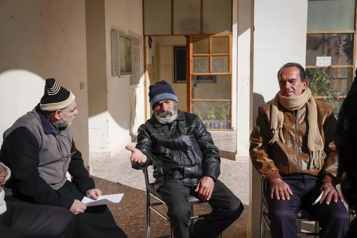 Father Jalal Ghazal, left, listens to Christians expressing security concerns outside the Church of Saint George in the town of Maaloula, Syria, Sunday, Jan. 12, 2025. (AP Photo/Omar Sanadiki)