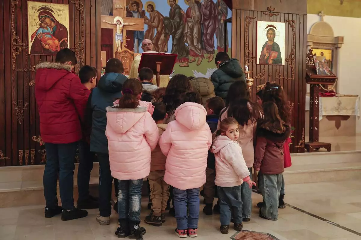 Children pray with Father Jalal Ghazal during Sunday Mass at the Church of Saint George in the town of Maaloula, Syria, Sunday, Jan. 12, 2025. (AP Photo/Omar Sanadiki)