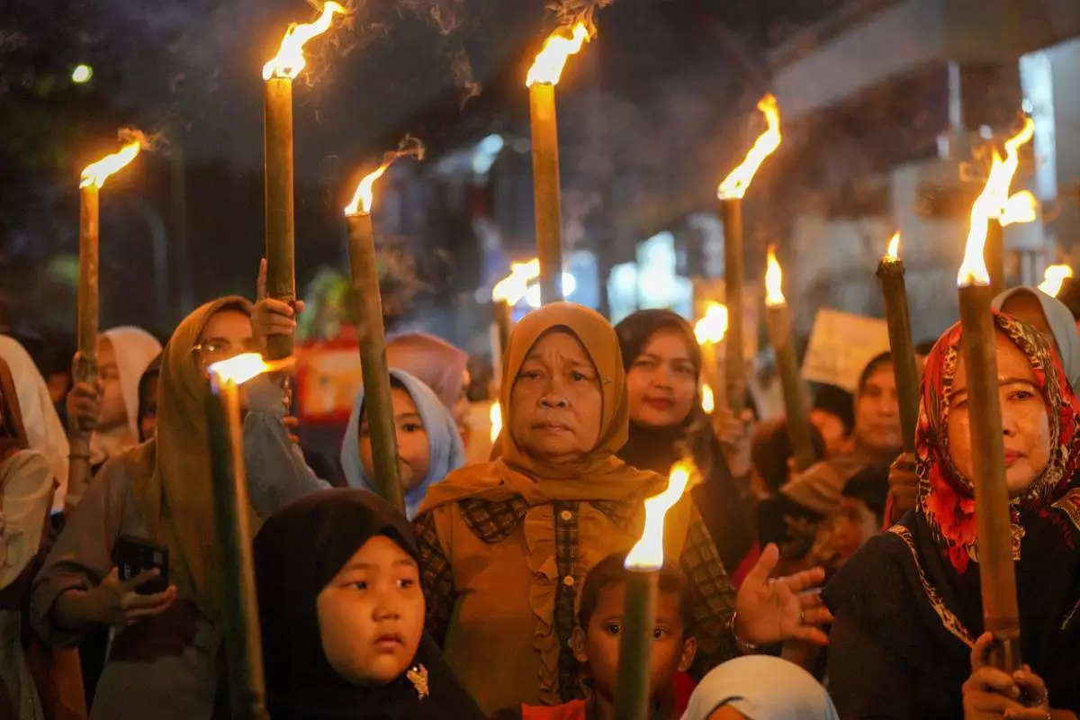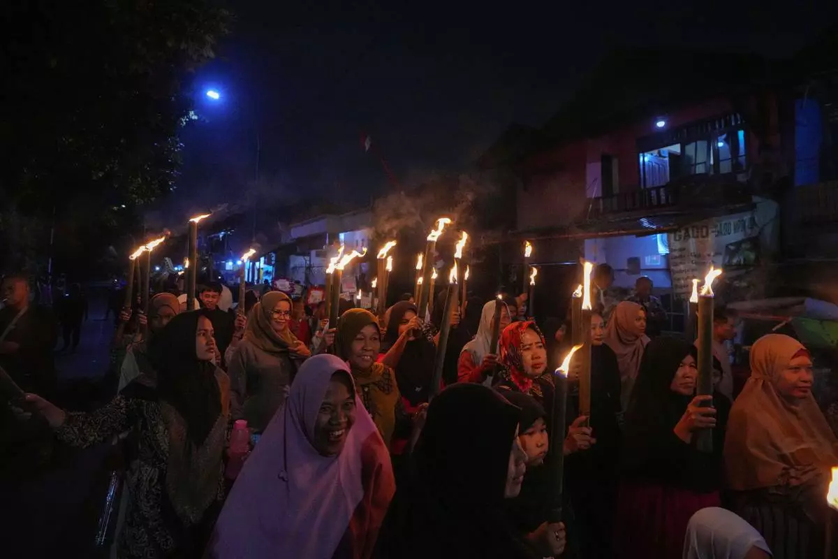 Muslim women hold torches during a parade ahead of the holy fasting month of Ramadan, in Tangerang, Indonesia, Thursday, Feb. 27, 2025. (AP Photo/Tatan Syuflana)