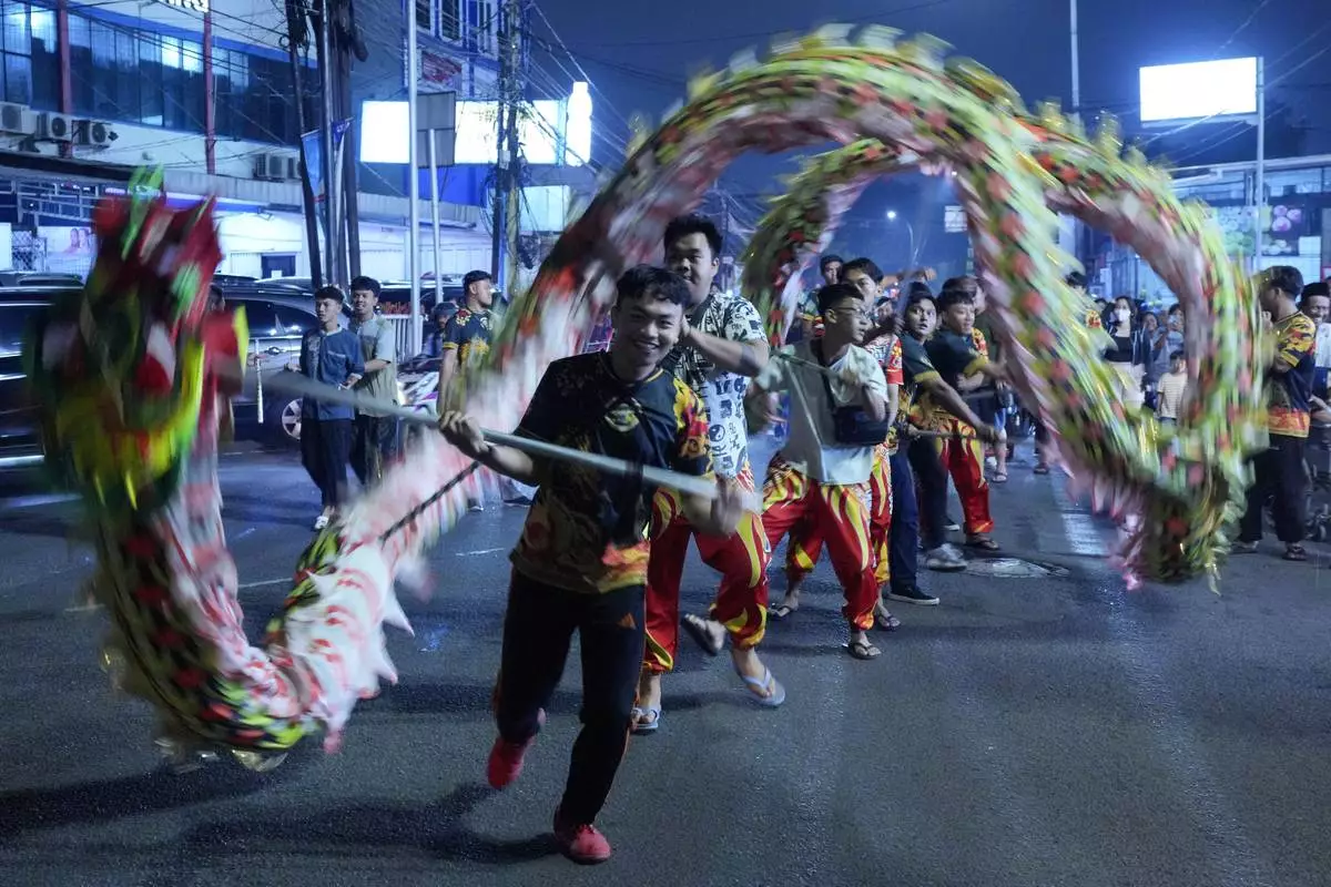 Dragon dancers perform in a torch parade parade ahead of the holy fasting month of Ramadan, in Tangerang, Indonesia, Thursday, Feb. 27, 2025. (AP Photo/Tatan Syuflana)