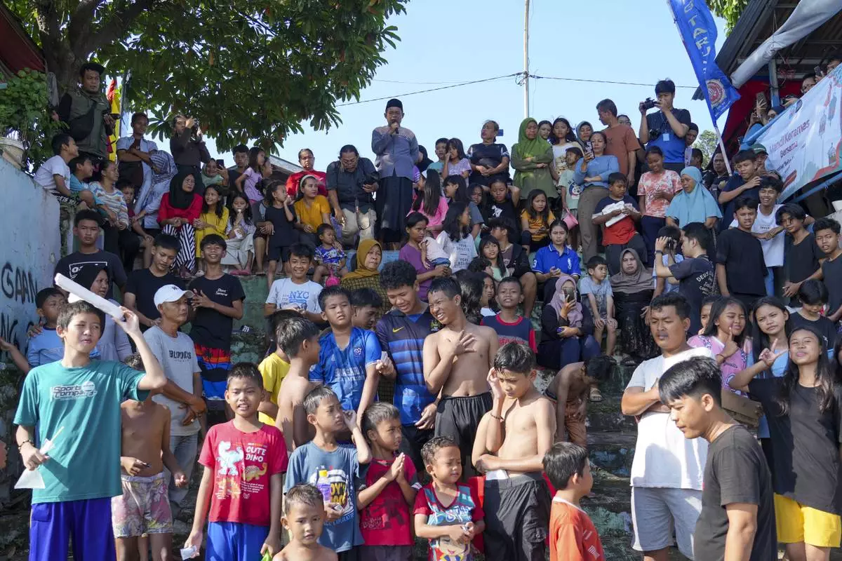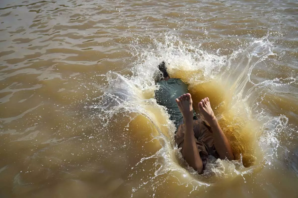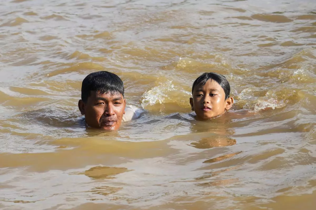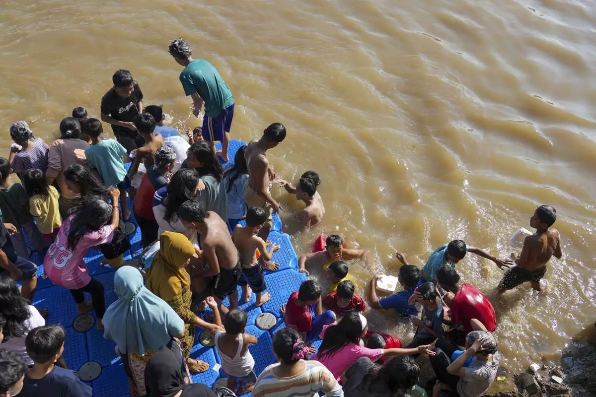 Samsul Anwar, left, and his nephew Argha al Khawarizmi swim in the Cisadane River, ahead the holy fasting month of Ramadan in Tangerang, Indonesia, Friday, Feb 28, 2025. (AP Photo/Tatan Syuflana)