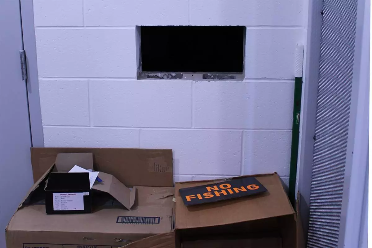 This undated photo provided by the Cullman County Sheriff's Office shows a hole on the wall next to the door to the evidence room at the Hanceville Police Department in Hanceville, Ala. Officials said the evidence room was not kept secure and could be accessed by the hole on the wall. (Cullman County Sheriff's Office via AP)
