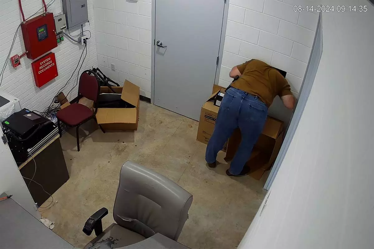 This image from a security camera footage provided by the Cullman County Sheriff's Office shows an individual who works at there sticks his head and upper body in the hole, attempting to open the door to the evidence room, at the Hanceville Police Department in Hanceville, Ala. Officials said the evidence room was not kept secure and could be accessed by a hole on the wall. (Cullman County Sheriff's Office via AP)