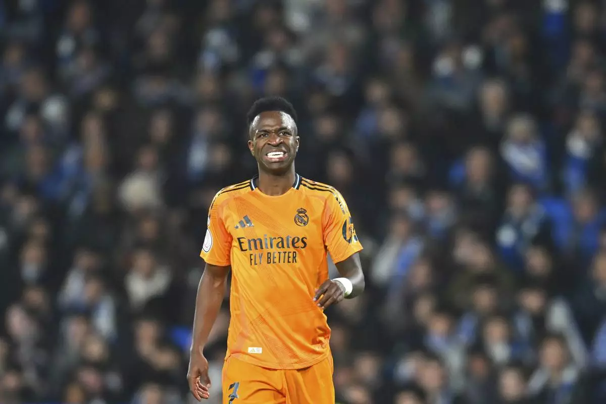 Real Madrid's Vinicius Junior reacts during the Spanish Copa del Rey soccer match between Real Sociedad and Real Madrid at the Reale Arena in San Sebastian, Spain, Wednesday, Feb. 26, 2025. (AP Photo/Miguel Oses)