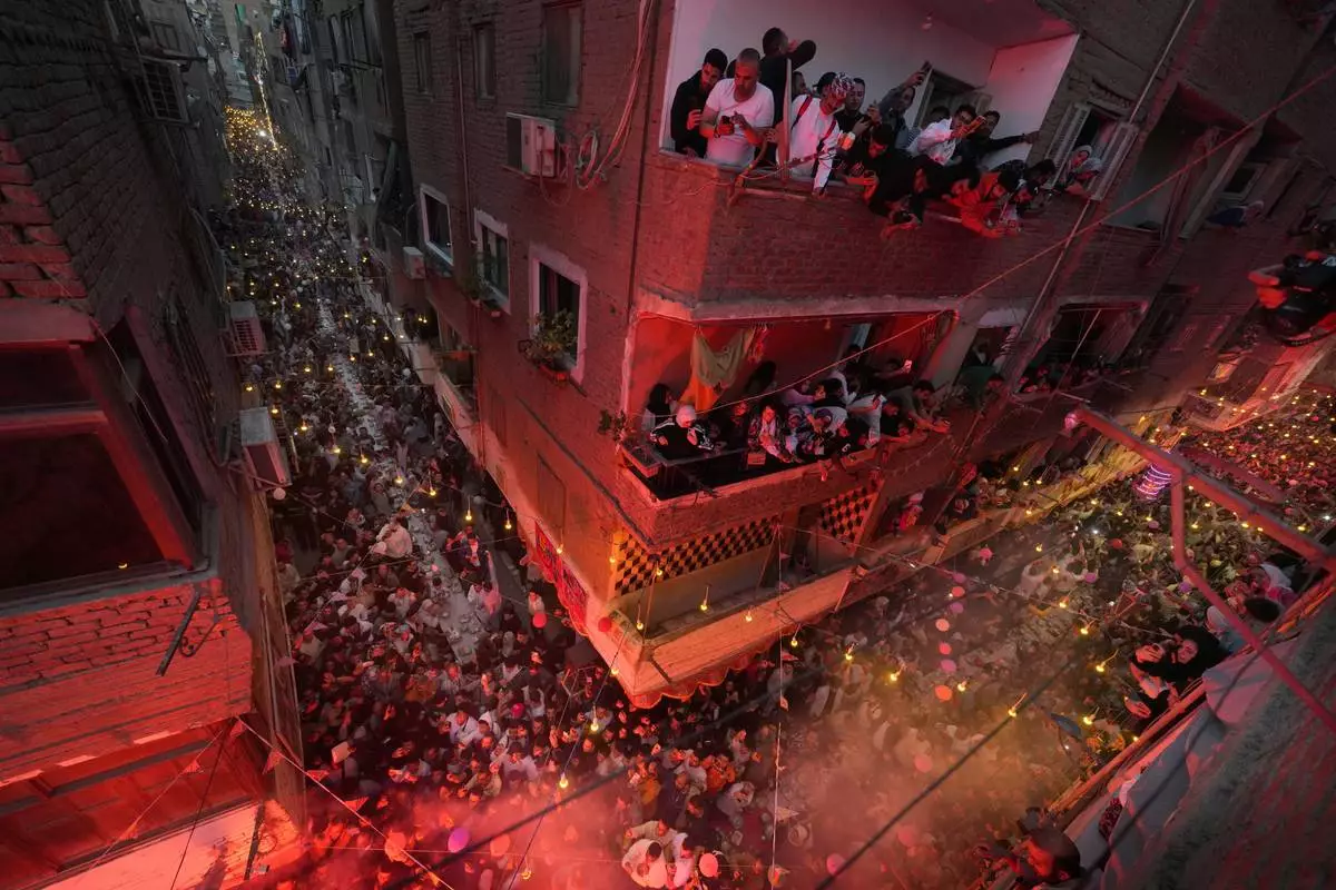 Residents of Ezbet Hamada in Cairo's El Matareya district peer from their balconies to celebrate a mass break-fast, "Iftar", the meal to end their fast at sunset, during the holy fasting month of Ramadan in Cairo, Egypt, Saturday, March 15, 2025. (AP Photo/Amr Nabil)