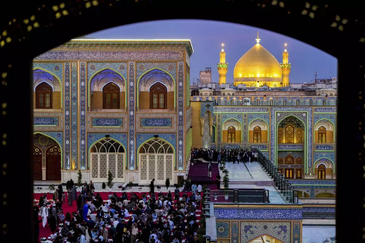 Shiites break the fast during the Islamic holy month of Ramadan in the Imam Ali shrine in Najaf, Iraq, Saturday, March 15, 2025. (AP Photo/Anmar Khalil)