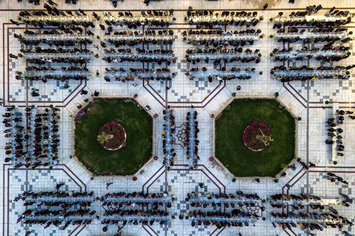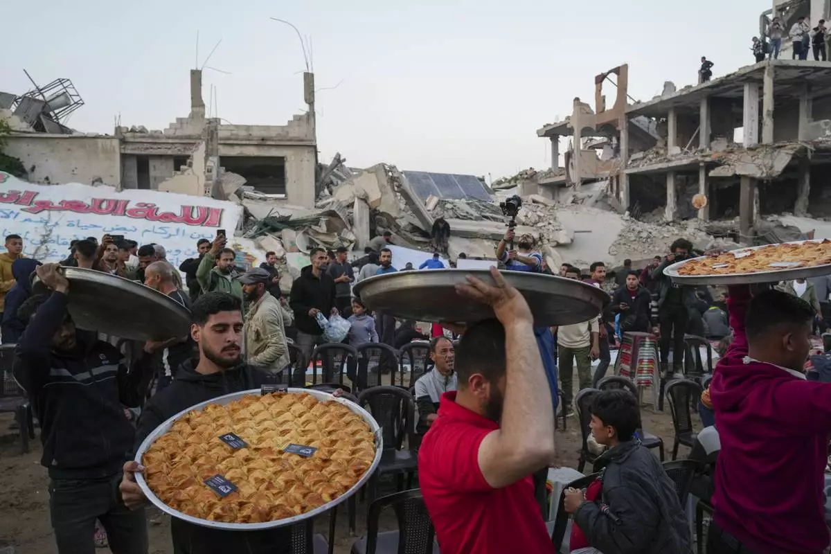 Palestinians sit at a large table surrounded by the rubble of destroyed homes and buildings as they gather for iftar, the fast-breaking meal, on the first day of Ramadan in Rafah, southern Gaza Strip, Saturday, March 1, 2025 (AP Photo/Abdel Kareem Hana)