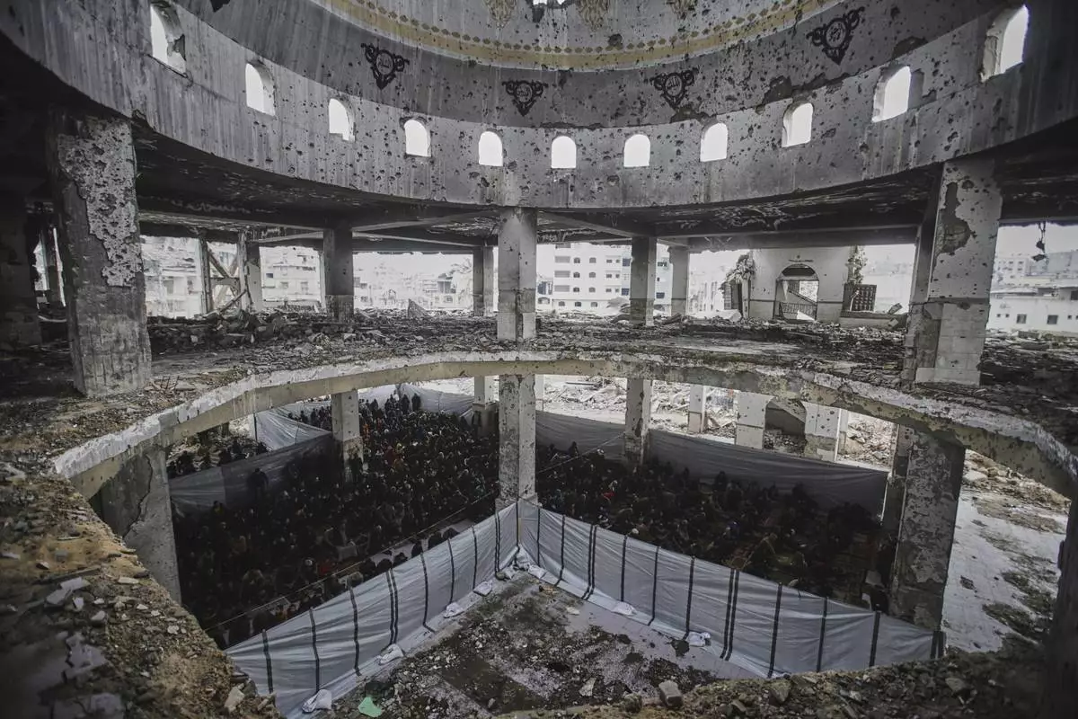 Palestinians pray during the first Friday prayers of the Muslim holy month of Ramadan at the Imam Shafi'i Mosque, damaged by Israeli army strikes, in the Zeitoun neighborhood in Gaza City, Friday March 7, 2025.(AP Photo/(AP Photo/Jehad Alshrafi)