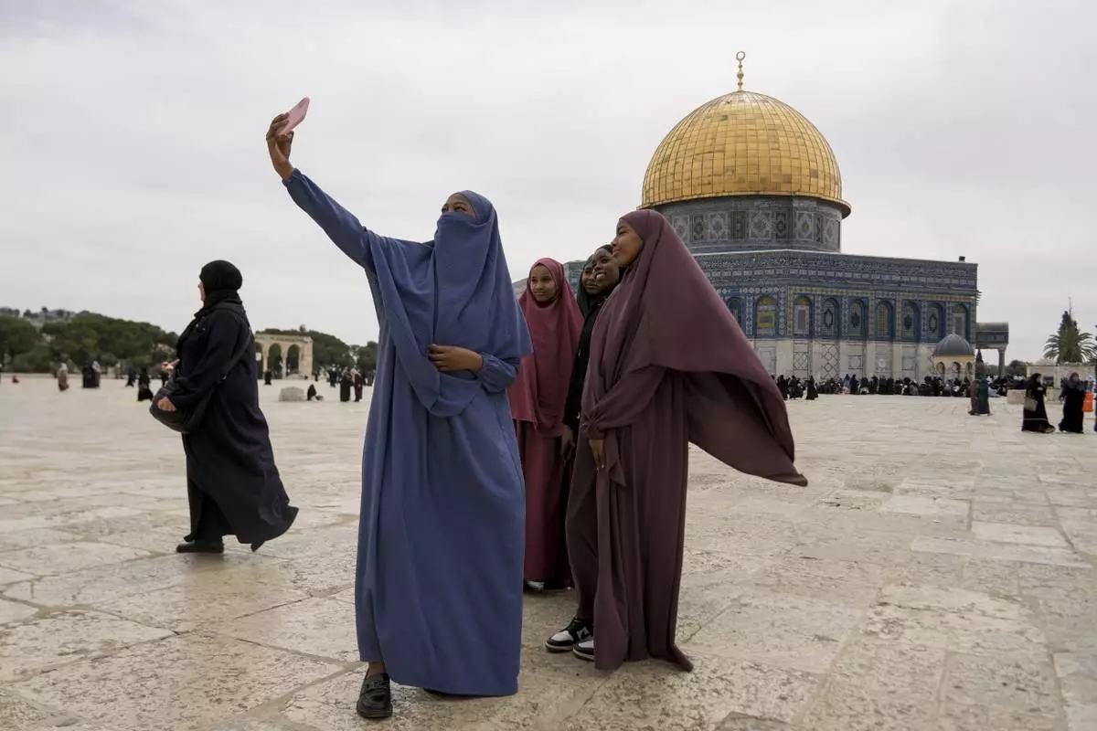 Palestinian women take a photo next to the the Dome of the Rock shrine at the Al-Aqsa Mosque compound in the Old City of Jerusalem, during the Muslim holy month of Ramadan, Friday, March 14, 2025. (AP Photo/Mahmoud Illean)
