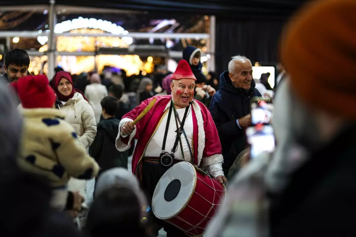 A man in a clown costume performs in a square on the first day of the Muslim holy month of Ramadan in Istanbul, Turkey, Saturday, March 1, 2025. (AP Photo/Khalil Hamra)