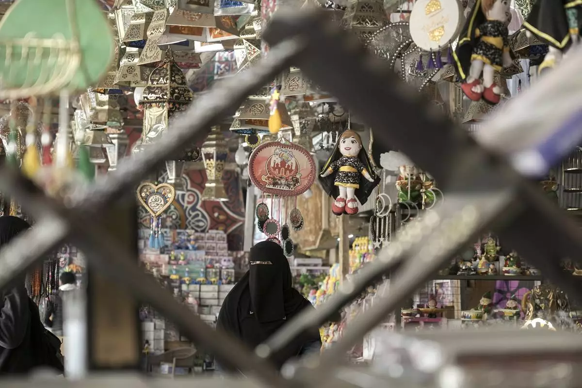 A woman buys decorations marking the holy month of Ramadan, in Cairo, Egypt, Friday, March 7, 2025. (AP Photo/Amr Nabil)