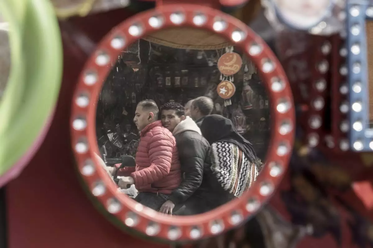 Visitors on a motor bike are reflected on Ramadan traditional decorations at a popular market marking the holy month of Ramadan, in Cairo, Egypt, Friday, March 7, 2025. (AP Photo/Amr Nabil)
