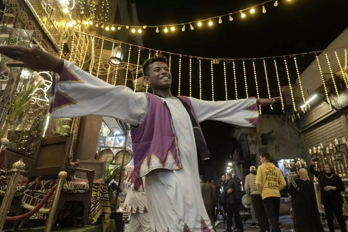 A dancer performs a Nubian dance to attract customers to enter a restaurant for a "Suhur" meal, before they start their fast during the holy fasting month of Ramadan, at El-Gamaliyya district in Cairo, Egypt, Tuesday, March 11, 2025. (AP Photo/Amr Nabil)
