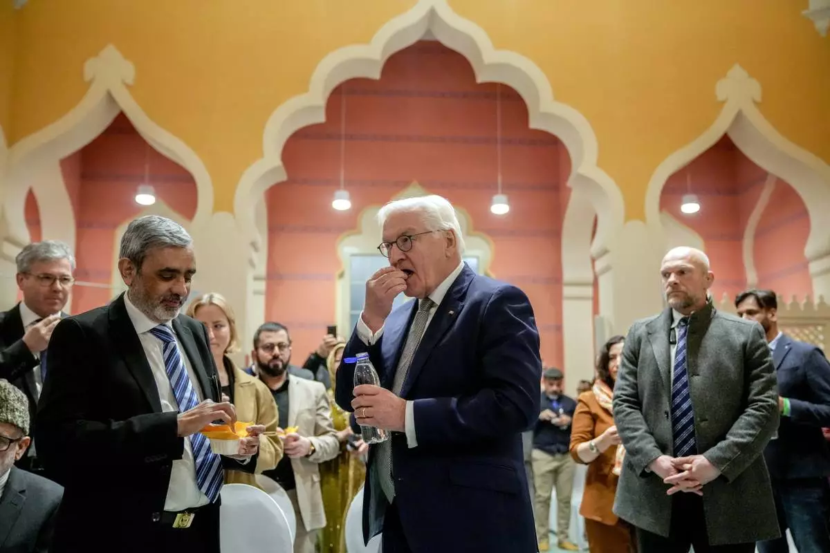 German President Frank-Walter Steinmeier joins fasting Muslims at an Iftar dinner at the Wilmersdorf mosque, during the Muslim holy month of Ramadan in Berlin, Germany, Wednesday, March 12, 2025. (AP Photo/Ebrahim Noroozi)
