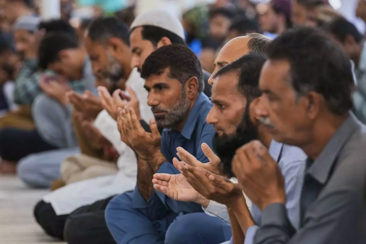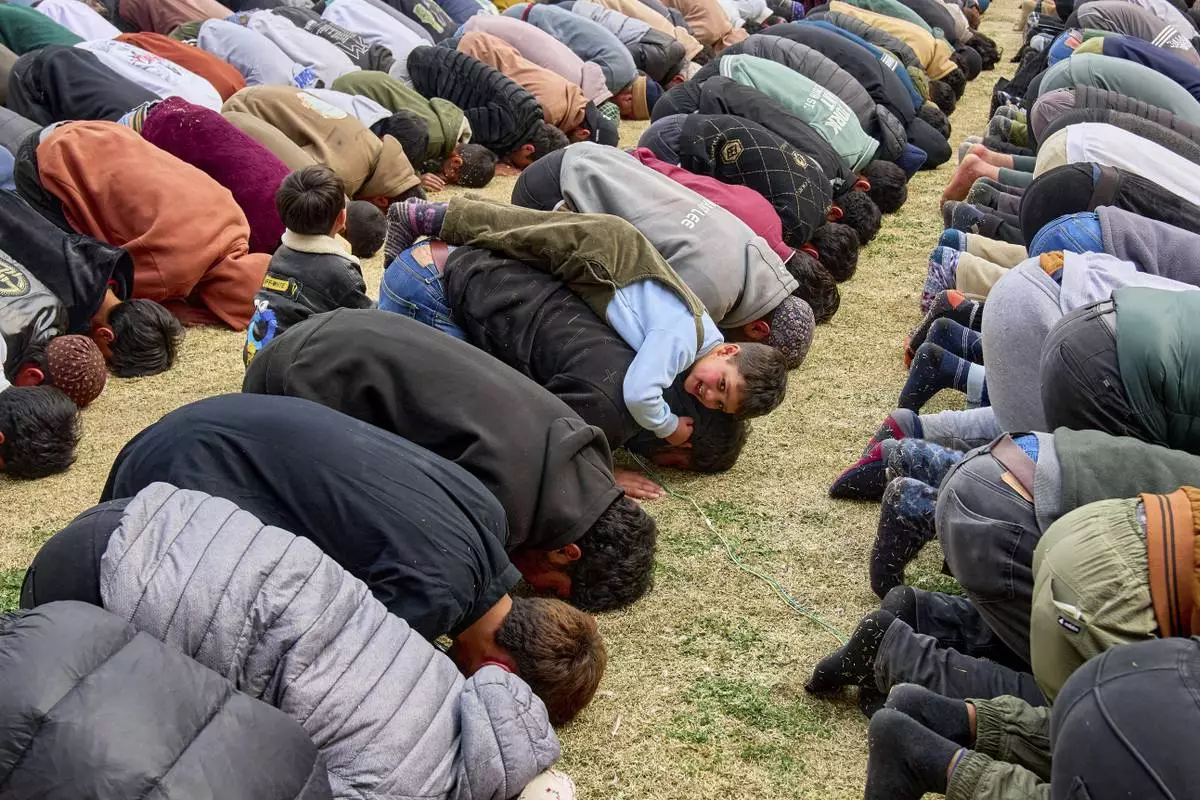 Kashmiri Muslims pray, as a boy plays on the back of his father, during the first Friday of the fasting month of Ramadan outside the Jamia Masjid or Grand Mosque in Srinagar, Indian controlled Kashmir, Friday, March 7, 2025. (AP Photo/Dar Yasin)