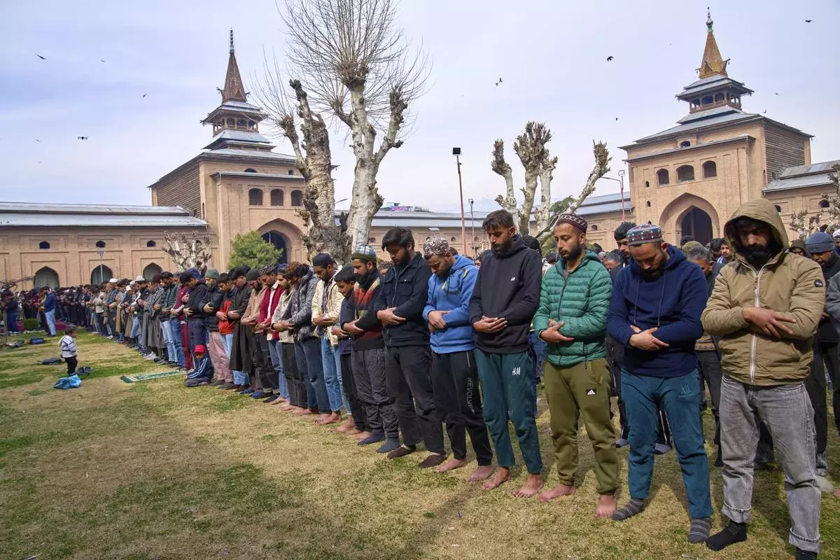 Kashmiri Muslims offer prayers during the first Friday of the fasting month of Ramadan outside the Jamia Masjid or Grand Mosque in Srinagar, Indian controlled Kashmir, Friday, March 7, 2025. (AP Photo/Dar Yasin)