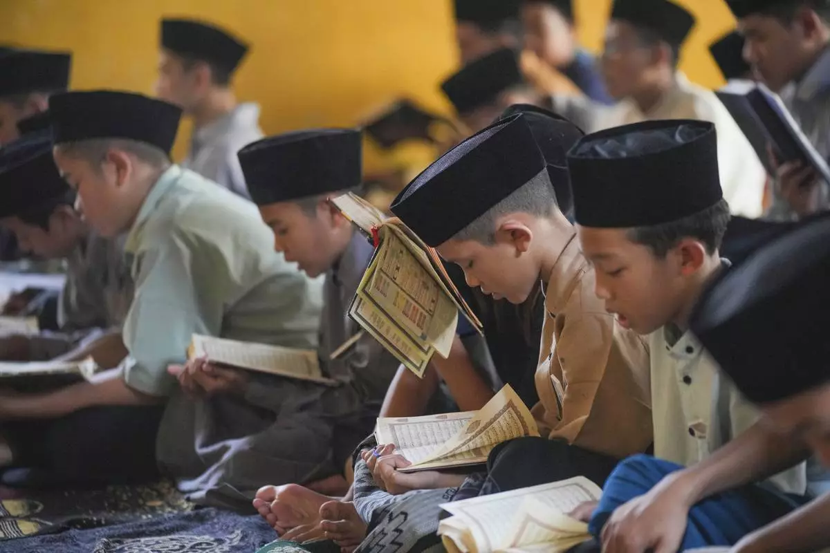 Students read the Quran during the holy fasting month of Ramadan at Daarut Tarqiyah Primago Islamic Boarding School in Depok on the outskirts of Jakarta, Indonesia, Thursday, March 6, 2025. (AP Photo/Tatan Syuflana)