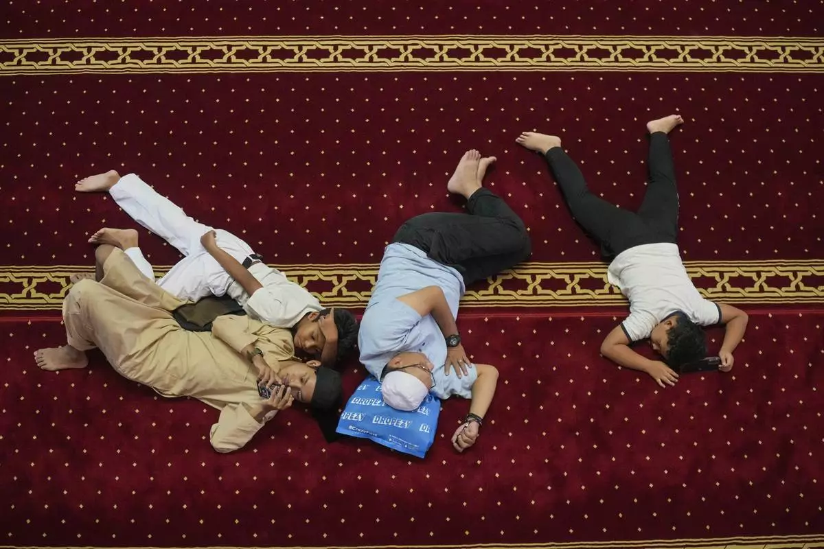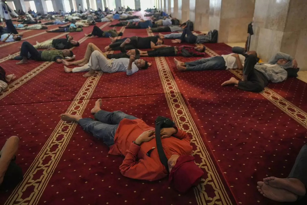 Indonesian Muslim men rest as they wait for the time to break their fast during the first day of the holy fasting month of Ramadan at Istiqlal mosque in Jakarta, Indonesia, Saturday, March 1, 2025. (AP Photo/Achmad Ibrahim)