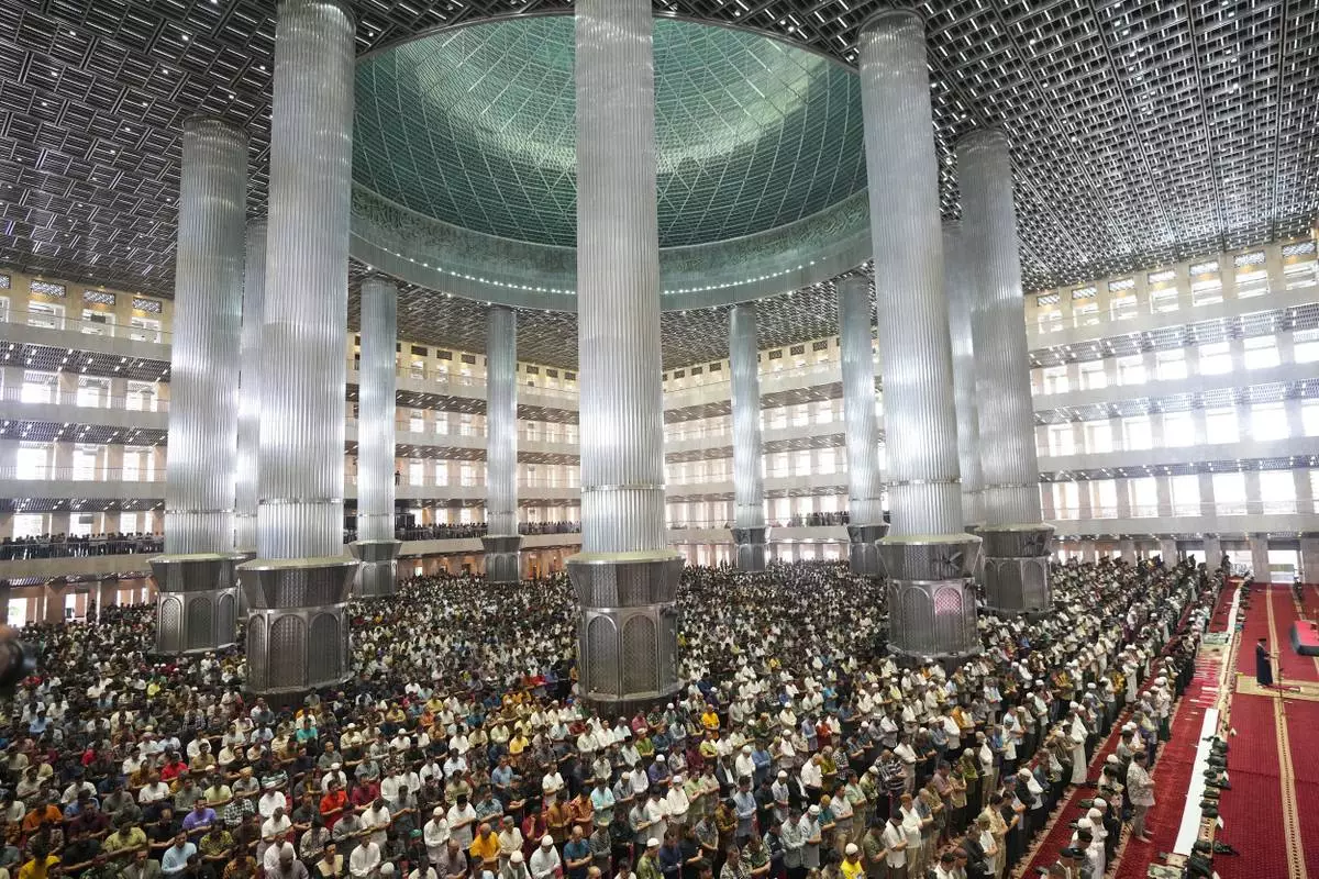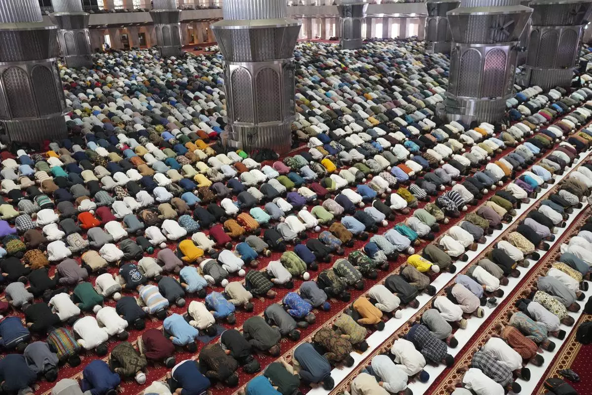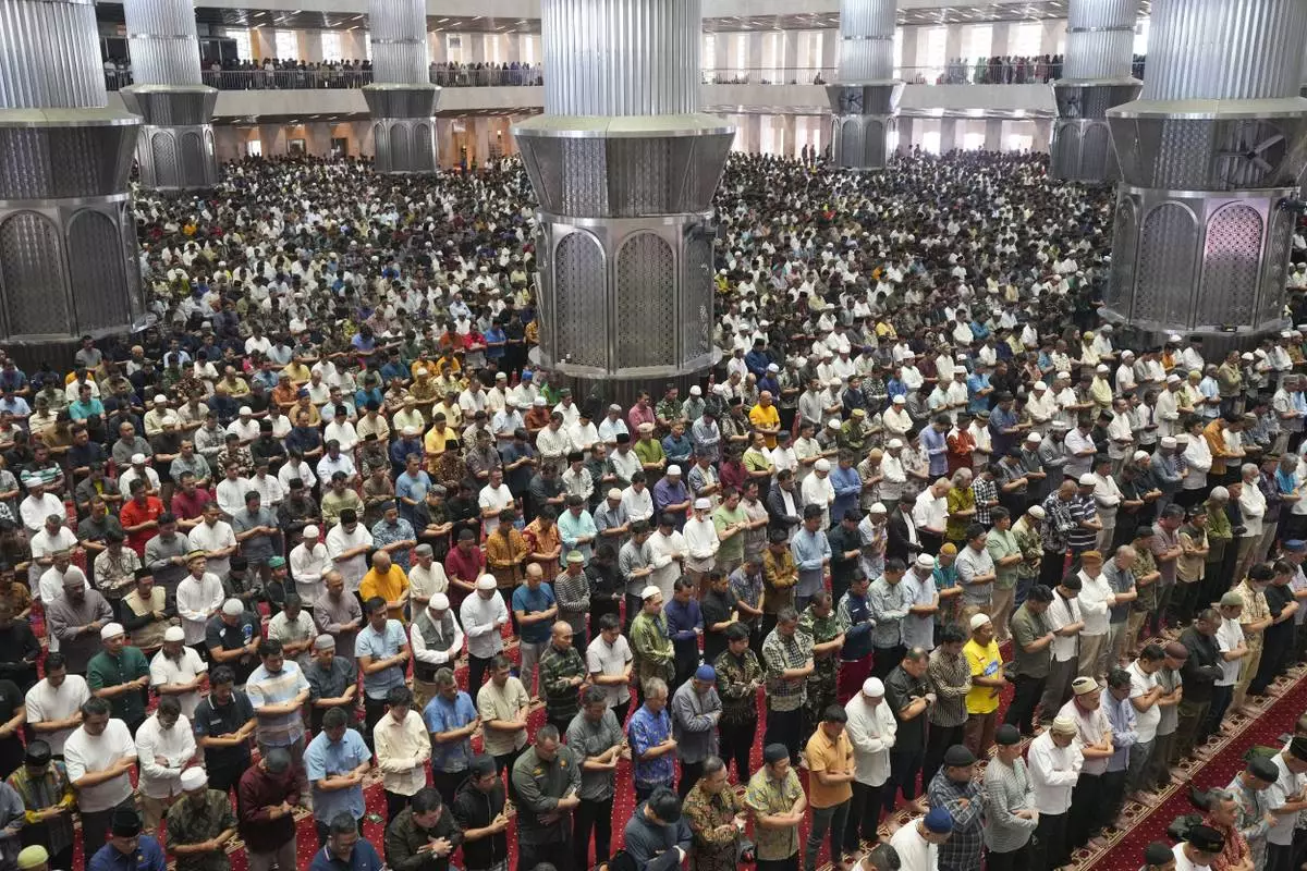 Muslim men perform during the first Friday prayer of the fasting month of Ramadan at Istiqlal Mosque in Jakarta, Indonesia, Friday, March 7, 2025. (AP Photo/Tatan Syuflana)