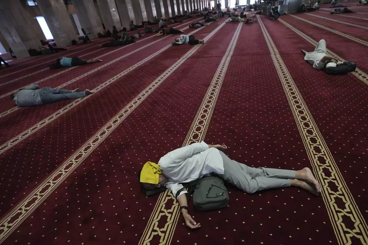 A man rests after the first Friday prayer of the fasting month of Ramadan at Istiqlal Mosque in Jakarta, Indonesia, Friday, March 7, 2025. (AP Photo/Tatan Syuflana)
