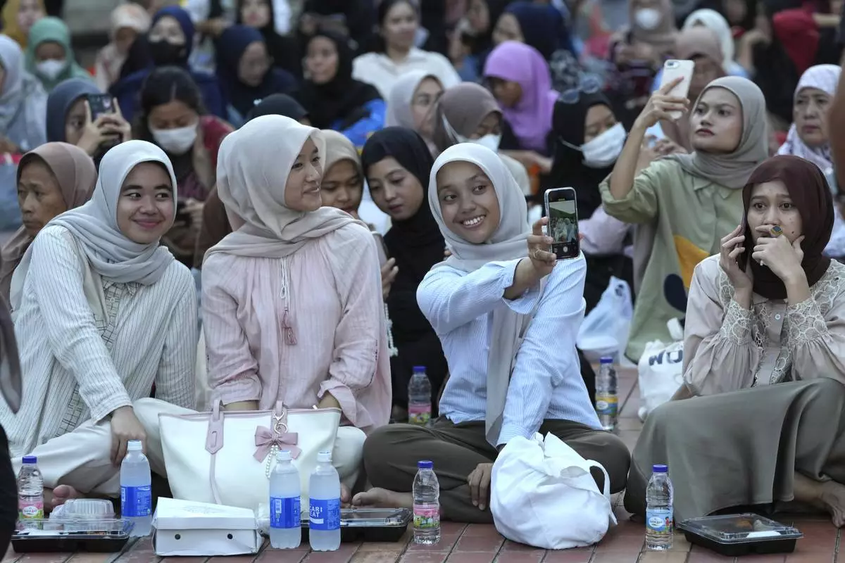 Muslims take a selfie as they wait for the time to break their Ramadan fast at Istiqlal Mosque in Jakarta, Indonesia, Saturday, March 1, 2025. (AP Photo/Achmad Ibrahim)