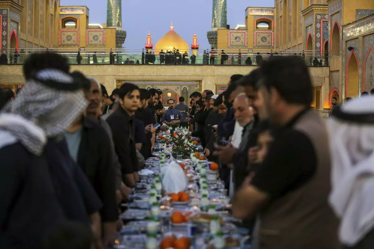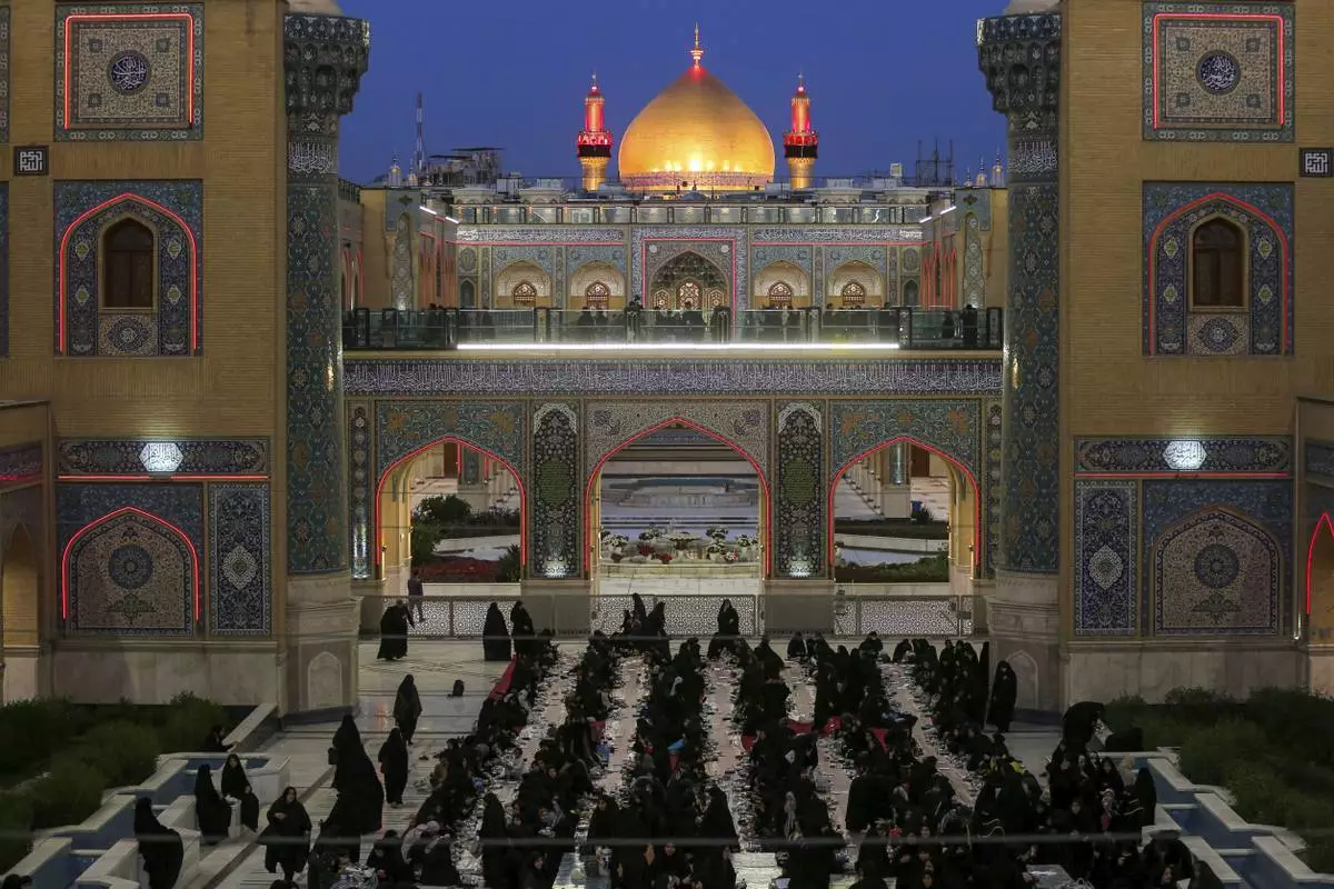 Shiites break their fast during the Islamic holy month of Ramadan in the Imam Ali shrine in Najaf, Iraq, Friday, March 21, 2025. (AP Photo/Anmar Khalil)