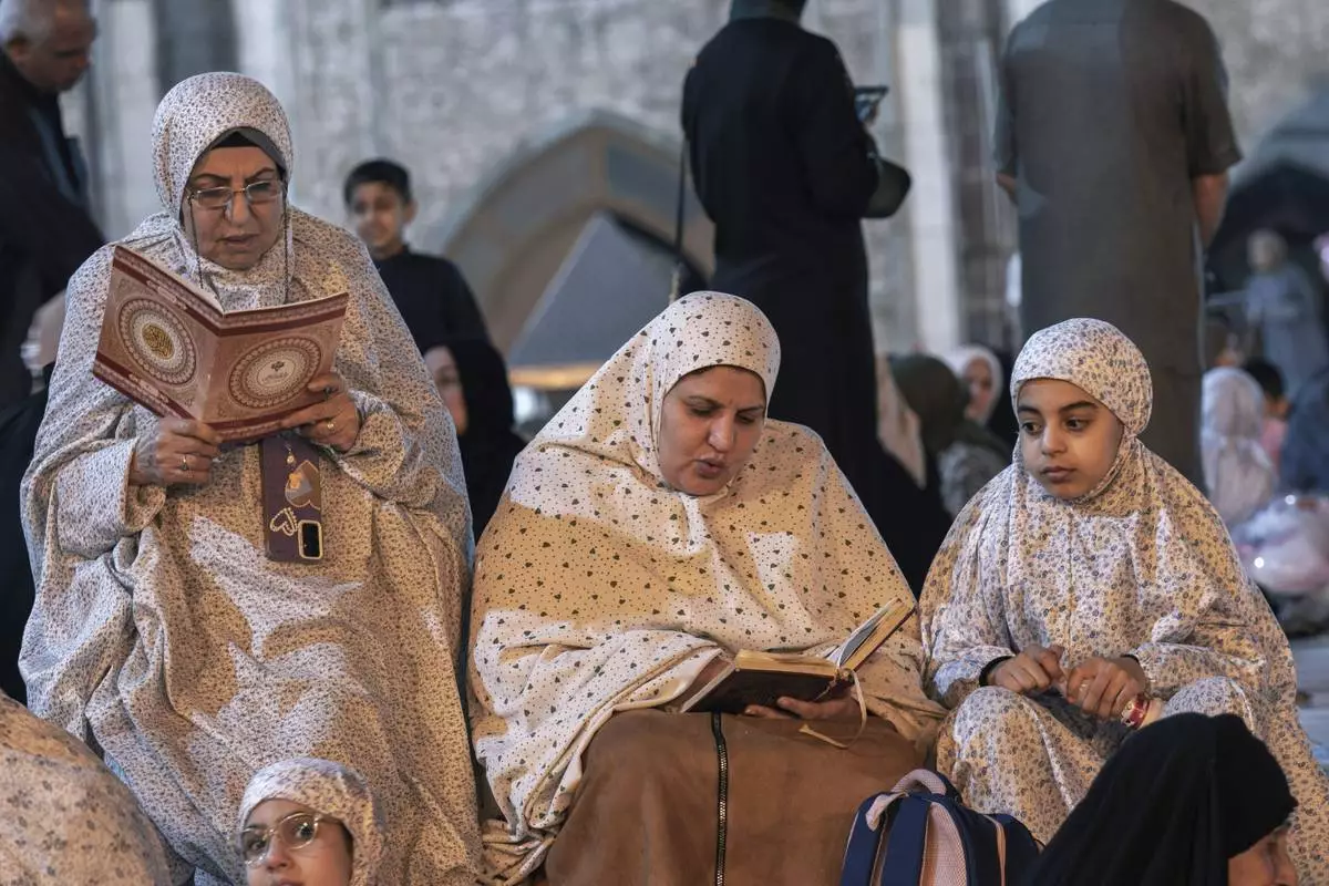 Sunni women read the Quran during Laylat al-Qadr, or the Night of Destiny, in the holy Sunni shrine of Abdul-Qadir al-Gailani, in the holy fasting month of Ramadan, in Baghdad, Iraq, Wednesday, March 26, 2025. (AP Photo/Hadi Mizban)