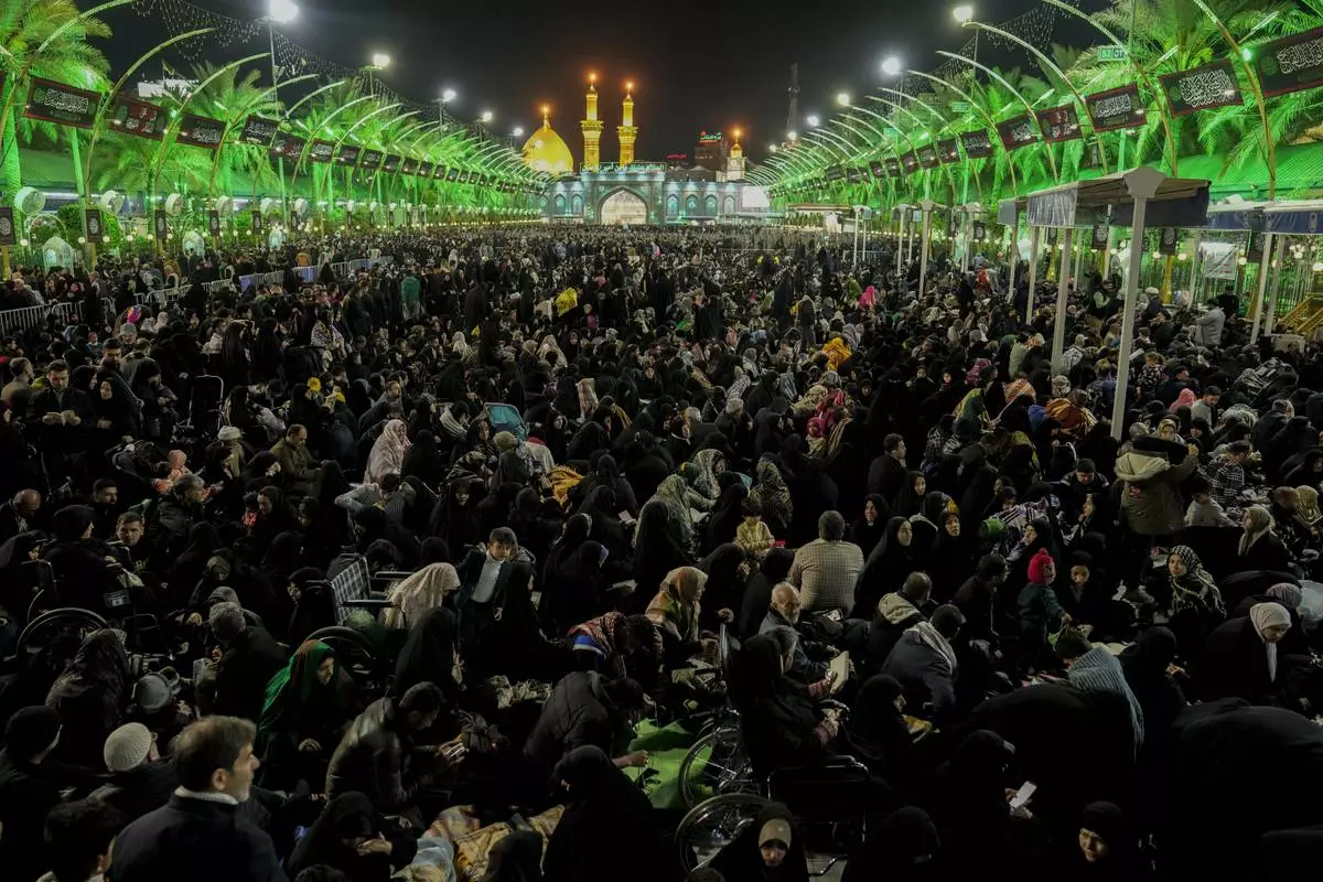 Shiite Muslim pilgrims visit the holy shrine of Imam Abbas during Laylat al-Qadr, or the Night of Destiny, during the holy fasting month of Ramadan in Karbala, Iraq, Sunday, March 23, 2025. (AP Photo/Hadi Mizban)