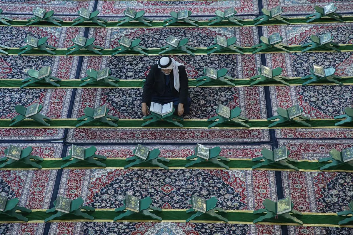 A Muslim reads verses of the Quran as he observes "Itikaf," that requires staying in seclusion in a mosque spending most time in prayer and reading the Quran during the last 10 days of the Islamic fasting on month of Ramadan, at the historical Mahabat Khan Mosque, in Peshawar, Pakistan Friday, March 21, 2025. (AP Photo/Muhammad Sajjad)