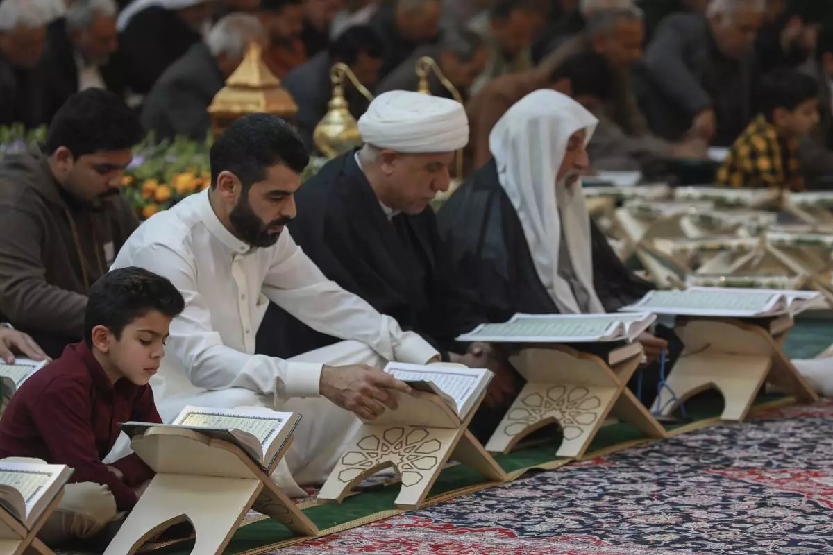 Shiites read the Quran at the shrine of Imam Abbas during the holy month of Ramadan in Karbala, Iraq, Wednesday, March 12, 2025. (AP Photo/Hadi Mizban)