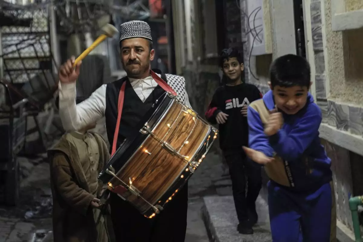 Bakr Qusay, a 35-year-old "mesaharati" or dawn caller wakes people up for a meal before sunrise, during the Islamic holy month of Ramadan, in the poor neighborhood of Fadhil district in Baghdad, Iraq, Wednesday, March 12, 2025. (AP Photo/Hadi Mizban)