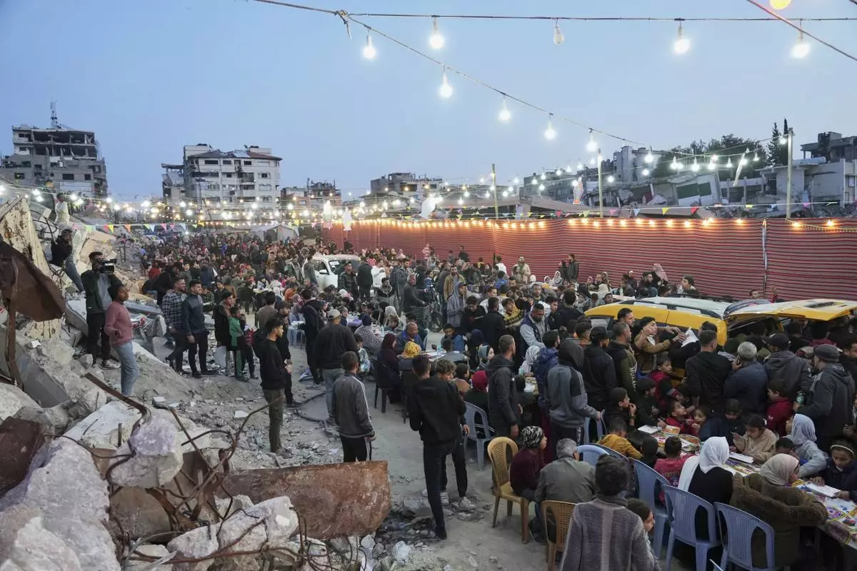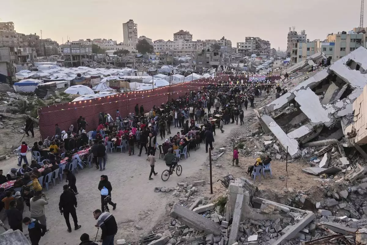 Palestinians sit at a large table surrounded by the rubble of destroyed homes and buildings as they gather for iftar, the fast-breaking meal, during Ramadan in Gaza City, Thursday March 6, 2025 (AP Photo/Abdel Kareem Hana)