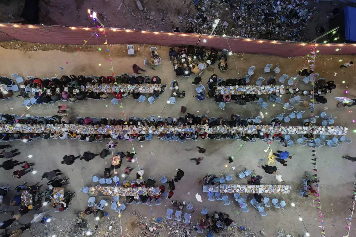 Palestinians sit at a large table surrounded by tents and the rubble of destroyed homes and buildings as they gather for Iftar, the fast-breaking meal, during Ramadan in Gaza City, Thursday March 6, 2025.(AP Photo/Mohammad Abu Samra)