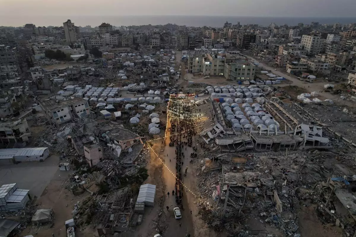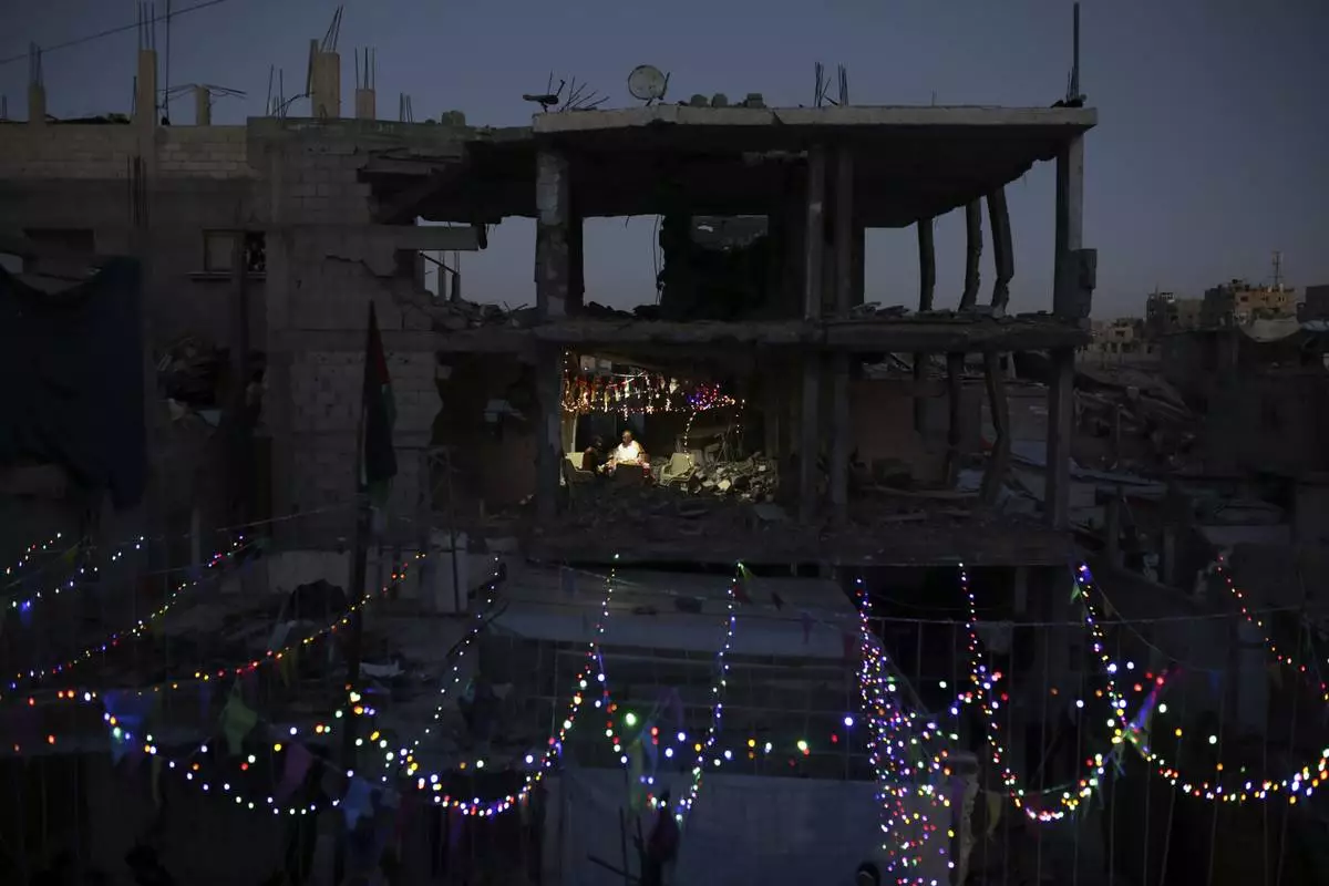 Festive lights are strung between destroyed Palestinian homes for the holy month of Ramadan in Khan Younis, southern Gaza Strip, Friday, Feb. 28, 2025. (AP Photo/Jehad Alshrafi)