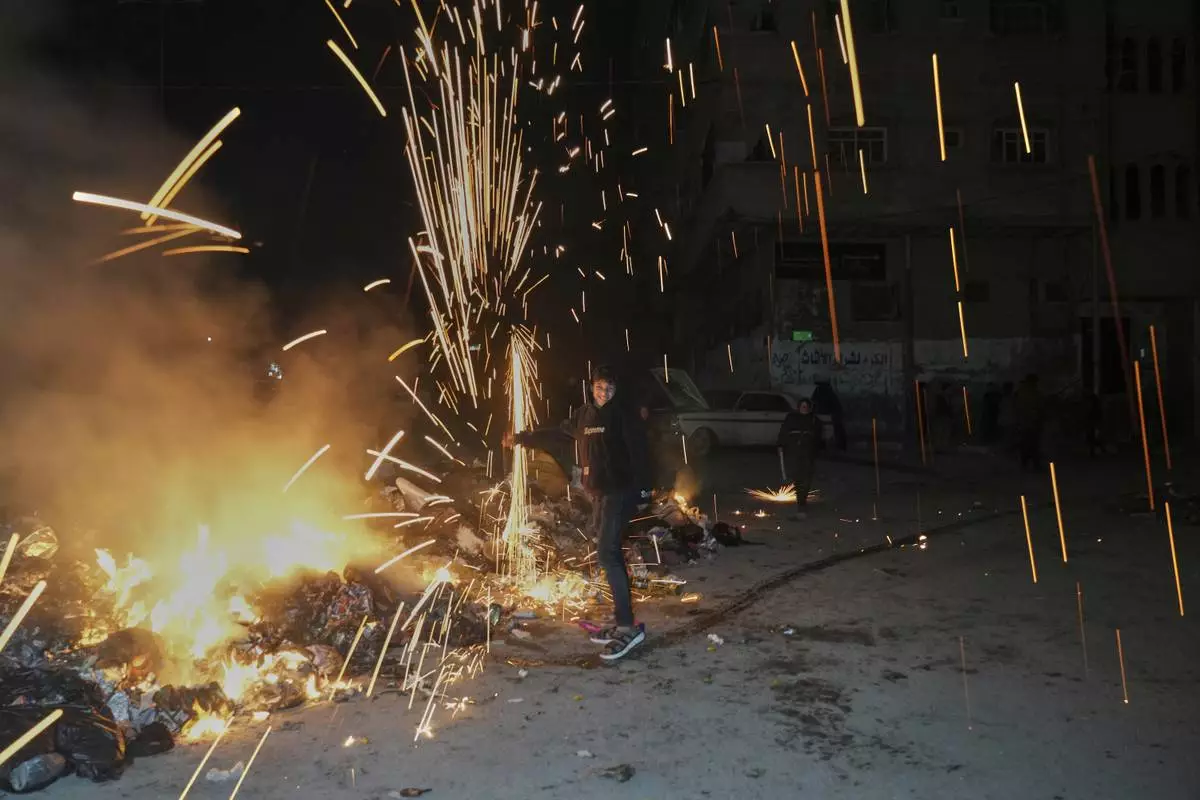 A boy plays with a firecracker after Iftar, the meal that breaks the fast during Ramadan, in Gaza City, Thursday, March 6, 2025. (AP Photo/Abdel Kareem Hana)