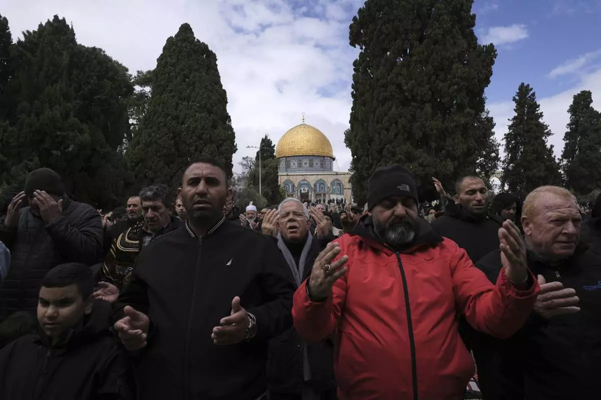 Palestinians perform Friday prayers at the Al-Aqsa Mosque compound in the Old City of Jerusalem, during the holy Muslim month of Ramadan, Friday, March 21, 2025. (AP Photo/Mahmoud Illean)